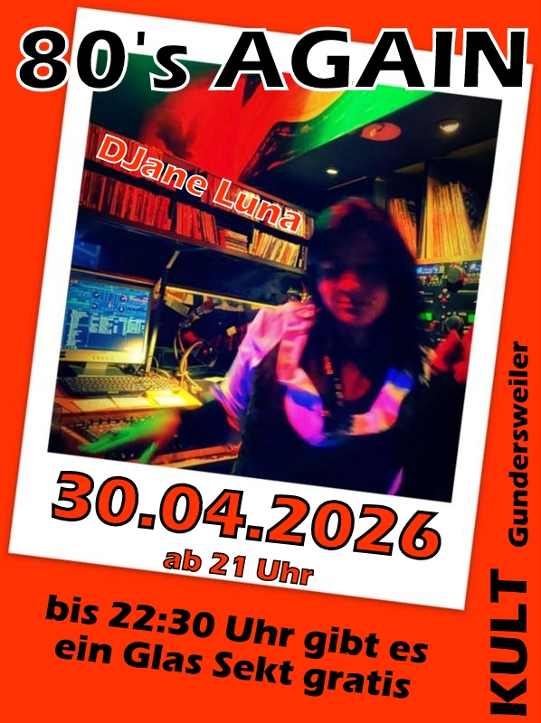 Termine * Samstag, 25.04.2026 ab 21 Uhr *Plattenparty* Frühlingserwachen im KULT! House, Disco, Techno & zeitlose Klassiker – natürlich 100% Vinyl *VINYL Tanzmusik* * Eintritt 5.- € * Donnerstag, 30.04.2026 ab 21 Uhr *80’s AGAIN Party* mit *DJane Luna* 80s Music … 80s Drinks … 80s Feeling … bis 22:30 Uhr gibt es ein Glas Sekt auf’s Haus Eintritt 2.- € *